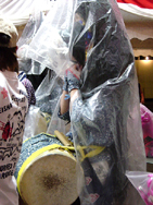 とはいえ獅子頭を雨の中に晒すわけにもいかないので、大きなビニール袋を獅子の頭から被せて「簡易レインコート」にした。写真にもあるけれどレインコートを着た獅子というのも何だかヘンな感じだ(^^;)。