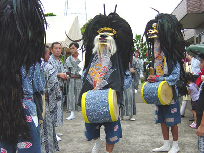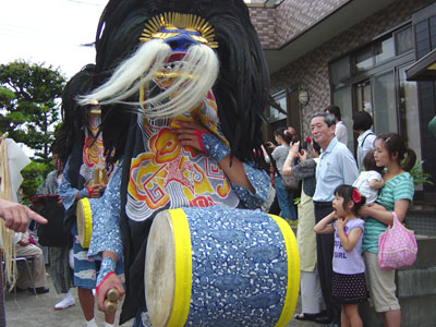 獅子はマスクのようにスッポリと頭に被るのではなく、頭の上に獅子頭を乗せてアゴ紐で固定する。そのため獅子は身長が2mを越えることになる。近くで見ると結構デカい!。この大きさが獅子の迫力を醸しだすことになる。