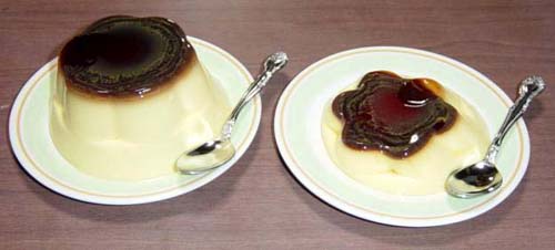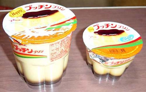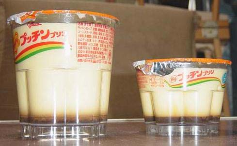 皿に乗せプッチンしてみた。コンビニ売りサイズの方は買い物途中で横倒しになったらしく、カップを逆さまにしようとしたところでプッチンする前にすべり出てしまった。そのため形がペシャンコに(^^;)。デカい方は無理なくプッチンすることが出来た。自重で崩れるかと思ったが、なんとも立派にそびえ立っている。コンビニ売りの方が形が崩れてしまったので大きさの対比が出来なかったのが残念だ。