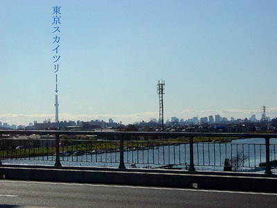 「新中川橋」の頂上から南方向を見ると、「東京スカイツリー」がある。この間、高さが500メートルに到達