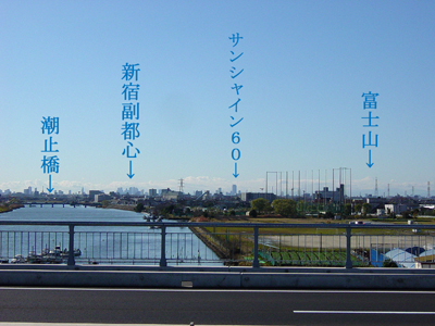 「新中川橋」頂上より中川河川敷を見る。河川敷には先々月に亡くなった飼い犬フランクの墓がある。