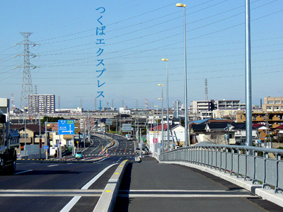 橋を下りた先に「つくばエクスプレス」の高架と列車が見える。