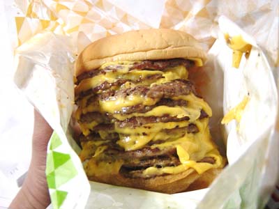ハンバーグ10枚重ね!(^^;)。ハンバーグとハンバーグの間にチーズが挟まっており、ハンバーグとチーズが交互に重なっている。その両端にパンズがある。