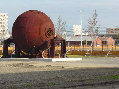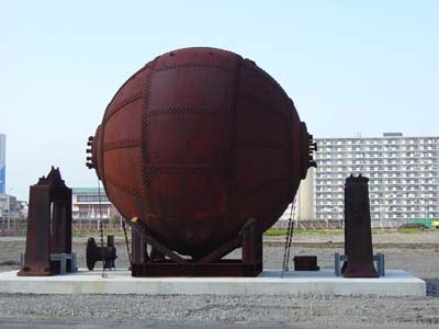 工場が閉鎖された今でも、その名残はモニュメント的な遺物として存在している。上の写真にある、その名も「地球釜」。「地球釜」とは、紙を製造中に出た屑パルプなどをドロドロにして、また紙を作れるようにする釜だ。