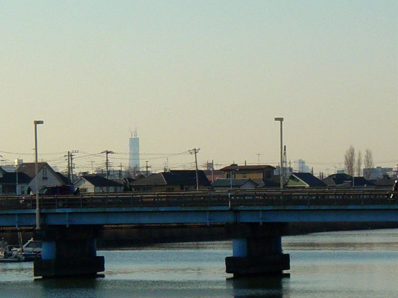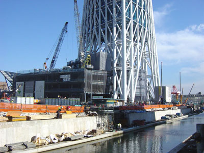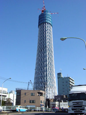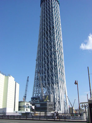 遠くに見えるのが現在建設中の「東京スカイツリー」、完成すれば全長600mを越す。東京タワーの約2倍の高さだ。