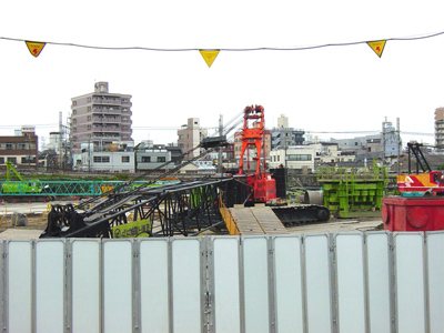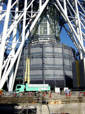 上の写真は2008年8月11日当時の建設現場の写真。フェンスより手間が堤防の道路で、この時はまだ通行可能だった。フェンスの向こうに建設現場が見えるが、まだツリーの姿形は無い。