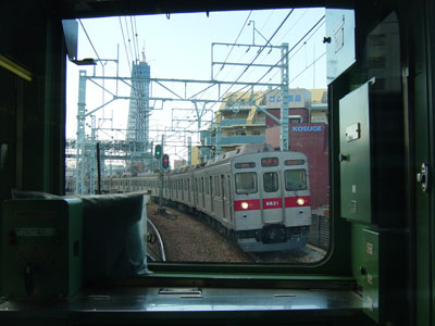 つくばエクスプレス「八潮駅」から乗り、「北千住駅」で東武伊勢崎線浅草行きに乗り換える。「曳舟駅」手前あたりで、電車の正面に巨大な「塔」が見えてきた。