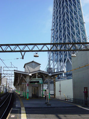 東武伊勢崎線「業平橋駅」。巨大な塔は駅のすぐ前にある。