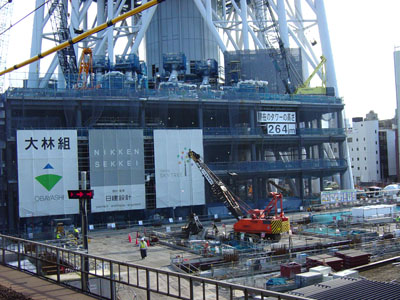 駅ホームから「東京スカイツリー」の建設現場が見える。「東京スカイツリー」の根元に「大林組」の看板が。スゲーな大林組!(^^;)。