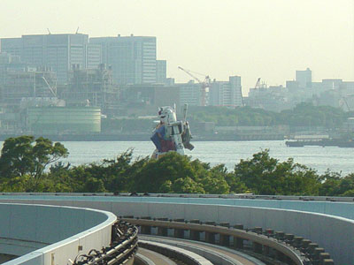 「お台場駅」に到着。ホームからガンダムが見える。森の上に上半身が突き出ているので、ガンダムの大きさがよくわかるし、また、作戦行動中のワンシーンにも見える(^^)。