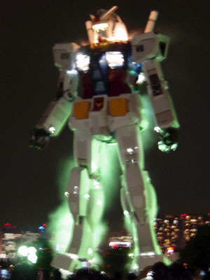 会場にガンダムの重厚なBGMが流れる。「人類が増え過ぎた人口を宇宙に移民させるようになって・・・」のソーンのあのBGMだ。一番盛り上がる「ジャジャーン」のところで目が点灯、ガンダムが起動する。ガンダムの頭が左右に動く。動くたびに「ギュイーン」というモビルスーツの起動音が鳴る。まさにアニメの世界から現実世界にやってきたようだ。そして胸の排気口から白煙が流れる。これは水を霧状に噴出したものらしいが、なかなからしくて効果的だ。