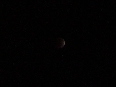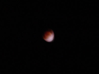 11時6分、月が地球の影に全部入る、皆既月食になった。写真はその瞬間のもの。標準ではもう光を捉えるのが難しい。